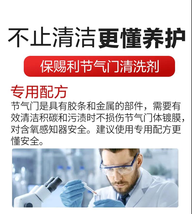 保賜利節(jié)氣門(mén)清洗劑,快速清除發(fā)動(dòng)機(jī)“咽喉”節(jié)氣門(mén)積碳油泥,恢復(fù)澎湃動(dòng)力。
